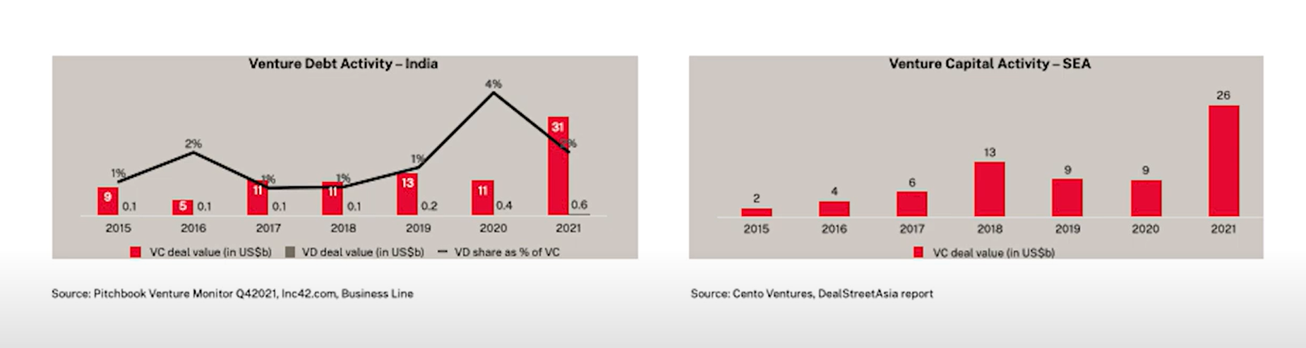 In Southeast Asia and India, venture debt remains comparatively new. In India, the third largest ecosystem in the world with over 100 unicorns, close to US$30 billion of venture capital was invested in 2021 but only US$ 600 million of venture debt was invested.